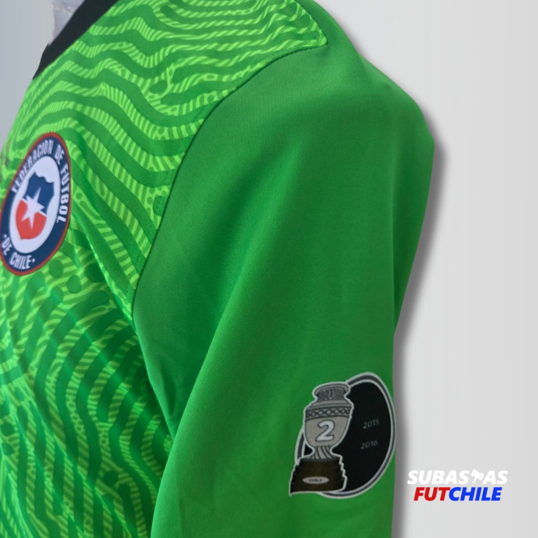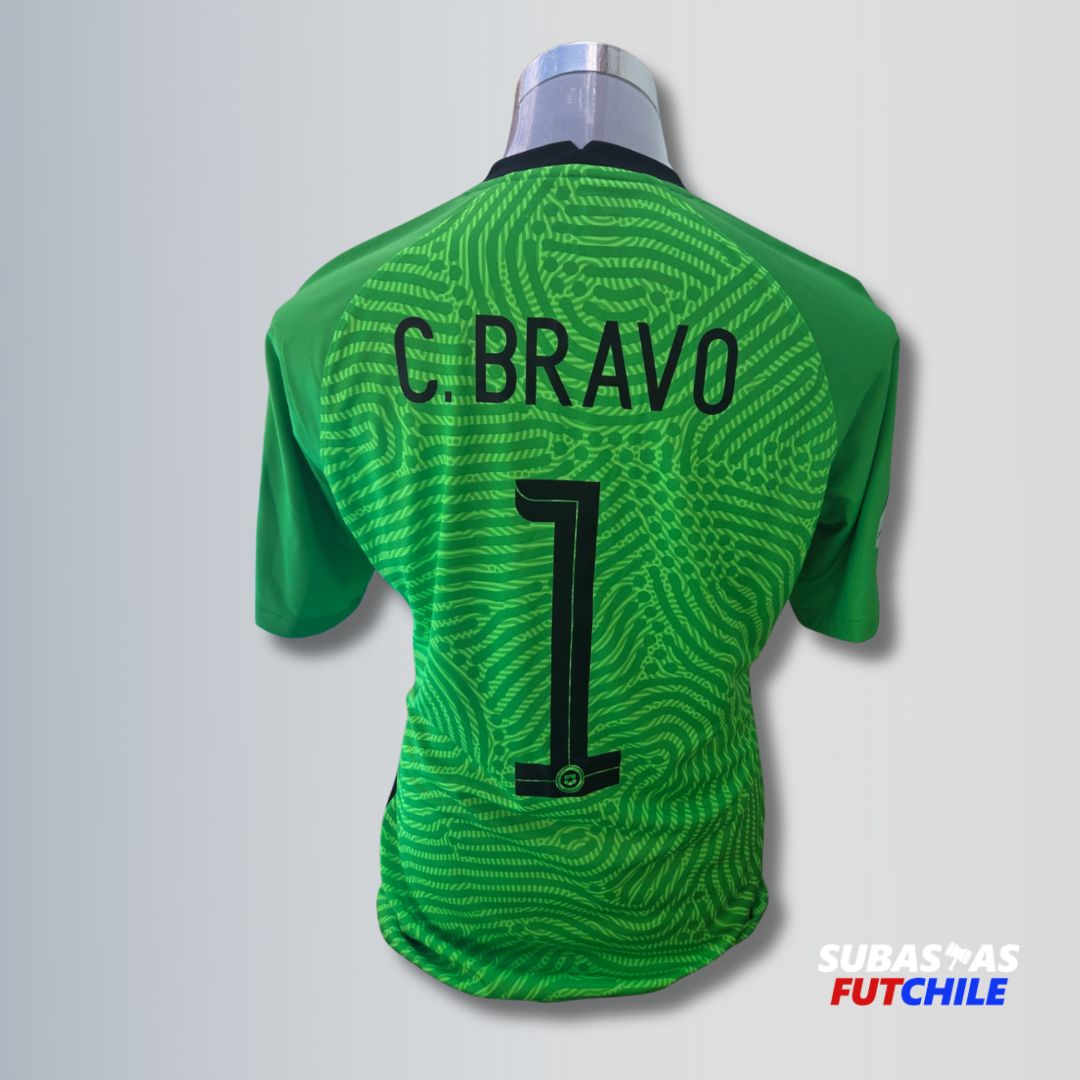 Camiseta utilería de la Selección Chilena del histórico arquero Claudio Bravo. Dorsal #1. Con parches oficiales y matchday correspondiente al partido versus Brasil. Nike tapado por conflicto judicial con la marca. Talla L.