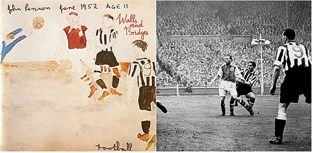 El dibujo de Lennon imita la fotografía más famosa de la final de ese 3 de mayo de 1952: Robledo de frente, observando cómo la pelota cruza la línea del arco del Arsenal.