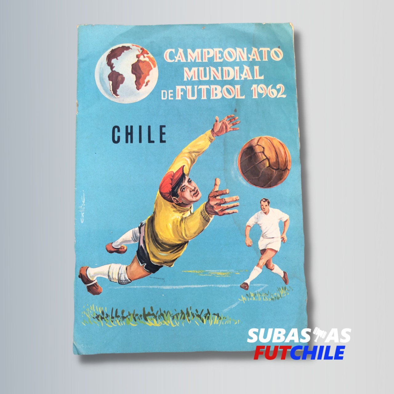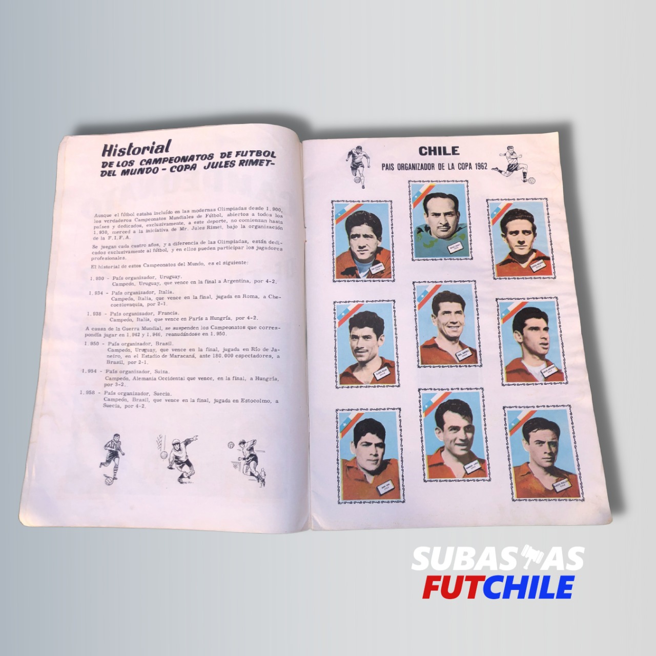 Álbum impreso oficial del Campeonato Mundial de Fútbol Chile 1962. Impreso en Chile por Coda y Cía. en Viña del Mar. Es uno de los 3 álbumes chilenos oficiales del Mundial, siendo este uno de los más difíciles de conseguir. Mide 31 por 21 cms. Se encuentra en excelente estado. Incluye todos los equipos participantes.