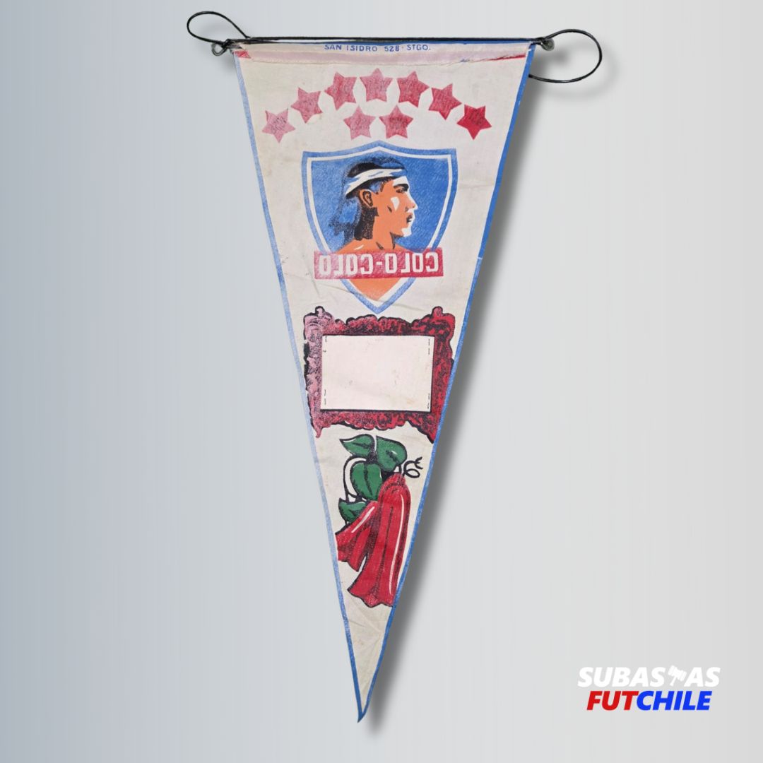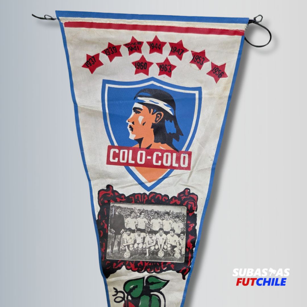 Banderín histórico de Colo-Colo con copihues de la década de los 60' con grandes jugadores como Beyruth, Valdés o Cruz. Con fotografía de época. De colección.