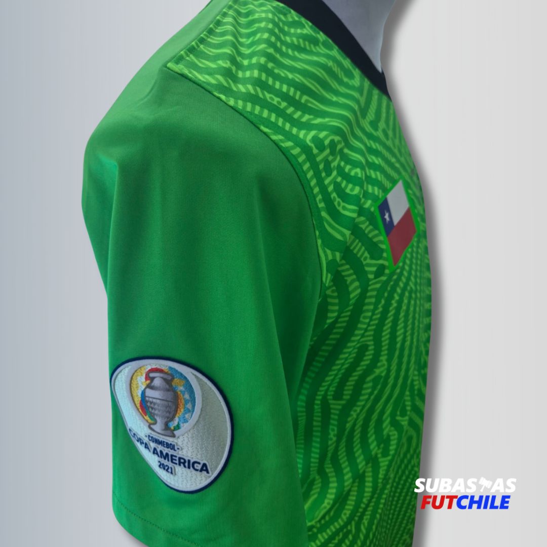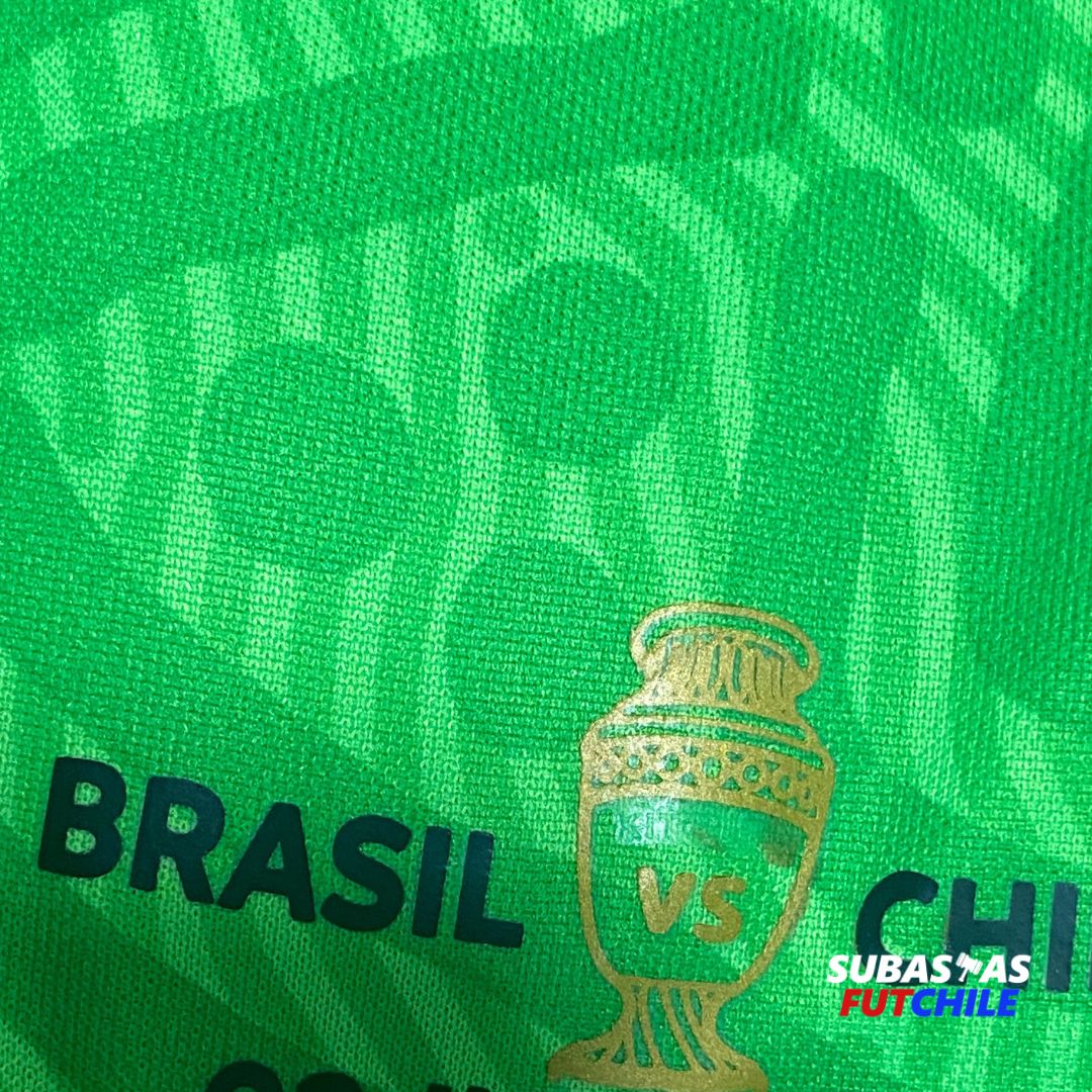 Camiseta utilería de la Selección Chilena del histórico arquero Claudio Bravo. Dorsal #1. Con parches oficiales y matchday correspondiente al partido versus Brasil. Nike tapado por conflicto judicial con la marca. Talla L.