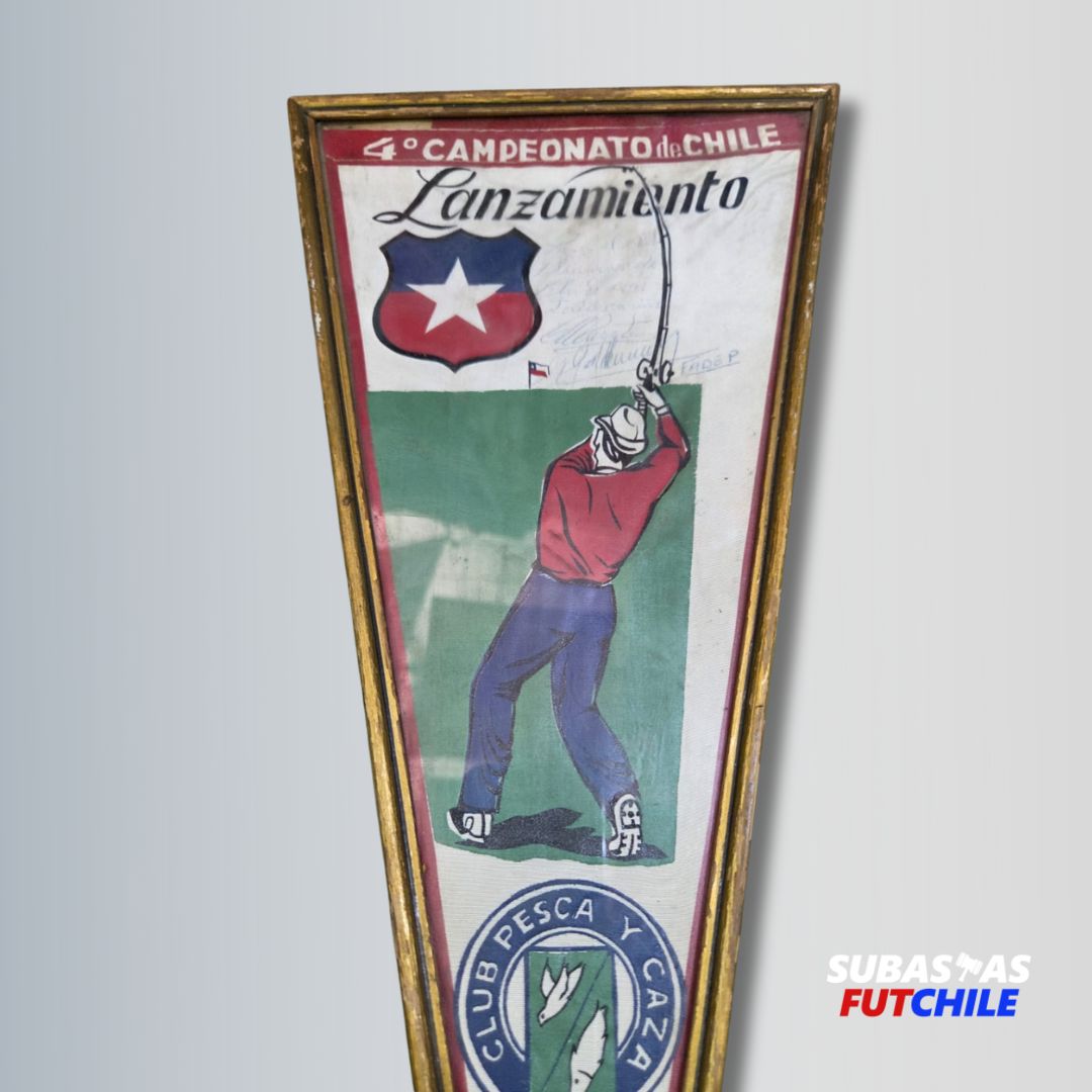 Banderín de colección del 4° Campeonato Nacional de Chile de Lanzamiento del Club Pesca y Caza del año 1963. Enmarcado. Medidas: 48 cms de largo